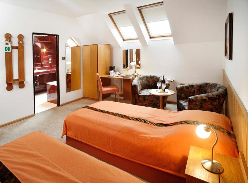 We are offering accomodation for maximum of 35 guests in large rooms, suites and family apartment. All areas of the pension are non-smoking. Smoking is allowed in the outdor atrium. The floors are covered by rugs, floating floors or PVC. Windows are equipped by curtains, drapery or roller blinds, which can provide complete dark. Beds are very comfortable, the measurements are 90 – 100cm x 200 – 210cm per each person.