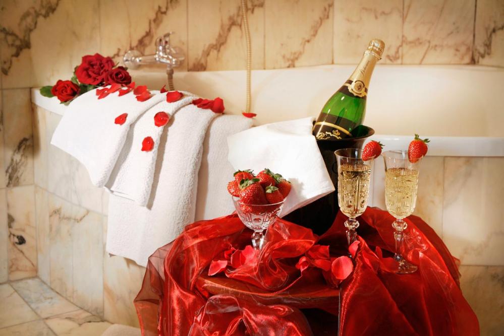 Romantický dvoudenní pobyt ve dvouluzkovém pokoji se snídaní (jedna snídaně do postele), jedna hodina v soukromém wellness s vířivkou a infrasaunou, 0,75 l lahev sektu, miska jahod, župany, bačkůrky, dekorace pokoje a koupelny okvětními plátky růží a mnoho jiného.